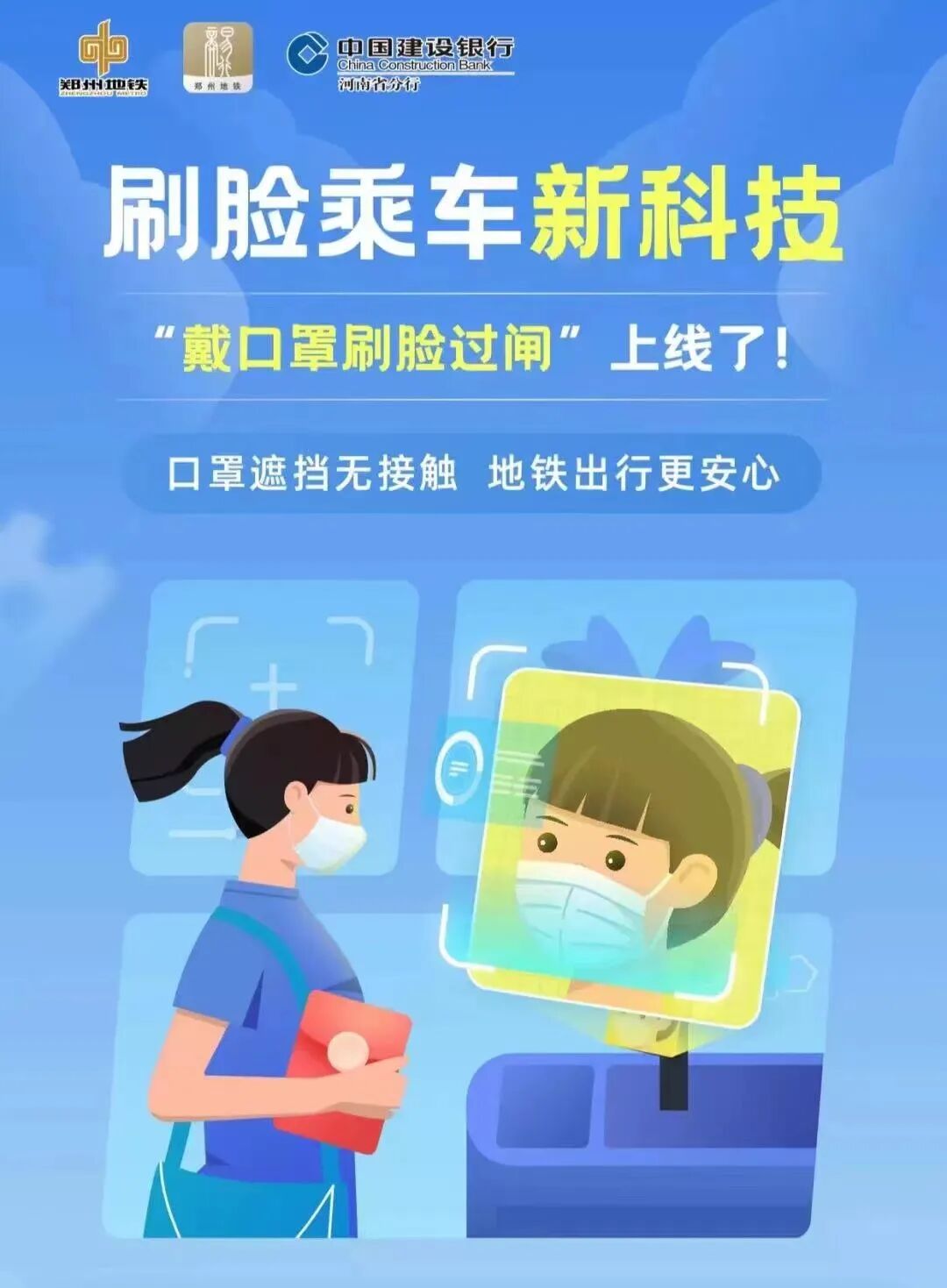 鄭州地鐵積極突破技術(shù)瓶頸,7月2日起,成功在1號線、2號線、4號線、5號線和城郊線一期上線支持“戴口罩刷臉過閘”功能,下載商易行APP,按照提示錄入臉部信息,點擊“開啟口罩識別”即可實現(xiàn)。乘客進(jìn)出站無需摘口罩,直接刷臉過閘乘車??谡终趽鯚o接觸,綠色出行更安心。