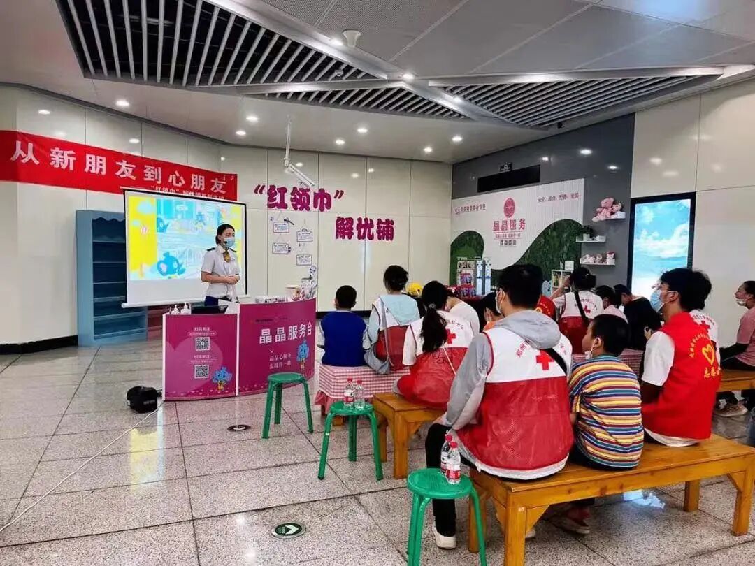 鄭州人民醫(yī)院站傾心打造“紅領(lǐng)巾”解憂鋪主題車站,2022年不斷豐富建設(shè)內(nèi)容,設(shè)置圖書借閱角、暖心作業(yè)桌、益智手工坊等適兒化服務(wù)設(shè)施,與周邊學(xué)校、社區(qū)開展崗位體驗、圖書捐贈、衛(wèi)生清掃、安全文明乘車宣講、急救技能培訓(xùn)、災(zāi)害防范技能提升等沉浸式課堂、互動式體驗活動,聯(lián)合金水紅十字會開展“新朋友到心朋友”主題幫扶系列活動,為兒童乘客定制溫情關(guān)懷服務(wù)。