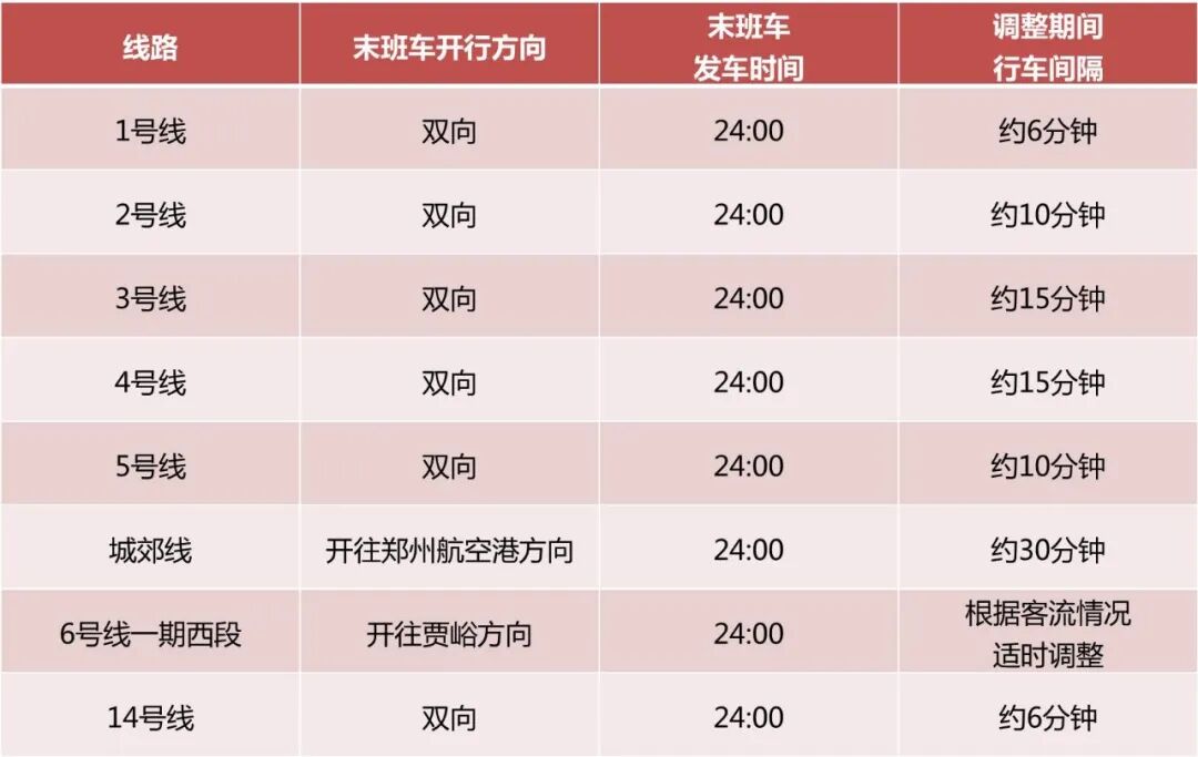 鄭州地鐵將密切關(guān)注客流變化,適時(shí)優(yōu)化14號(hào)線行車間隔。乘車時(shí),請(qǐng)您留意各站出入口首末班車時(shí)間牌,聽從工作人員指引,安全有序出行。