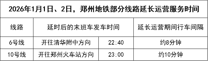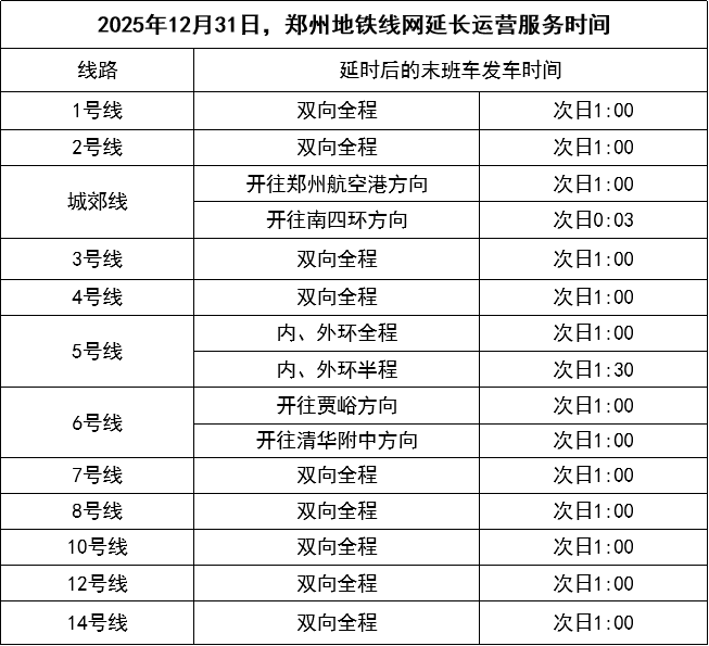 跨年夜延長運營時間。2025年12月31日,鄭州地鐵線網(wǎng)運營時間總體延長至次日1:00。1:00后將根據(jù)客流實際情況,適時組織加開列車。